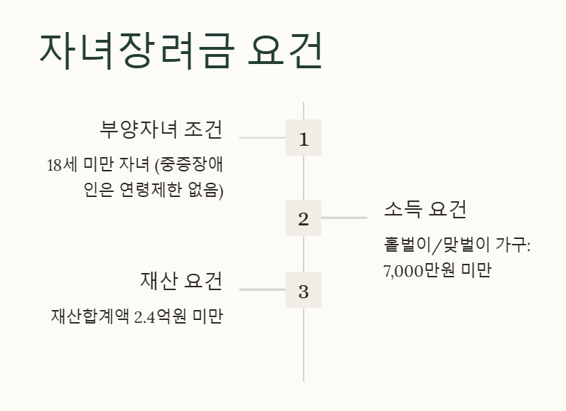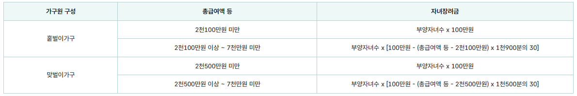 - 부양자녀 : 18세 미만(중증장애인은 연령제한 없음), 연 소득금액 1백만 원 이하