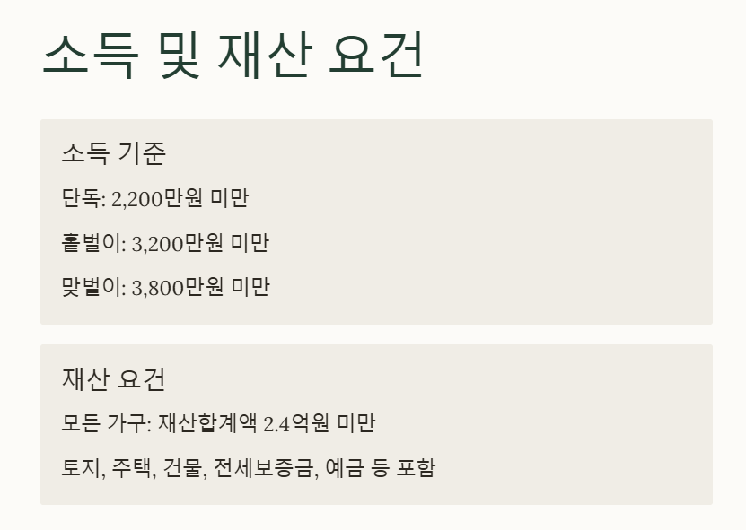 - 재산요건 : 전년도 6월 1일 현재 주택, 토지, 건물, 전세보증금, 예금 등 재산합계액이 2.4억 미만일 것.