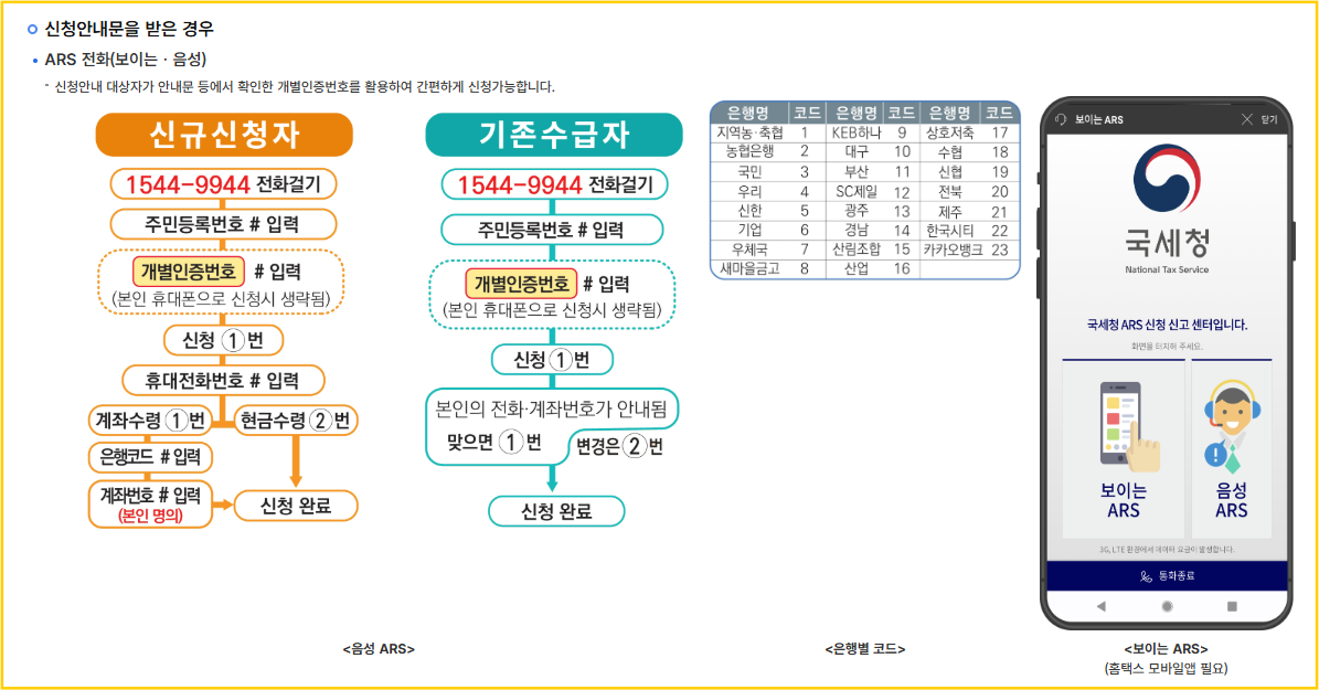 - 국세청 홈페이지, 모바일 앱 및 📞ARS(자동응답) 전화 신청 가능