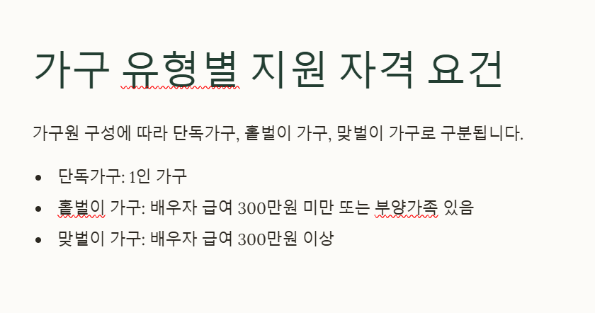 - 홑벌이 가구 : 배우자의 총 급여액 등이 300만 원 미만이거나, 부양자녀 또는 부양부모가 있는 가구