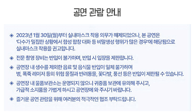 실내마스크 착용 의무가 2023년 1월 30일 월요일부터 해제되었지만, 본 공연은 '다수가 밀집한 상활에서 함성 합창 대화 등 비말 생성 행위가 많은 경우'에 해당하기 때문에 실내마스크 착용을 권고한다고 합니다. 기타 주의사항은 아래내용을 참고 해주세요.