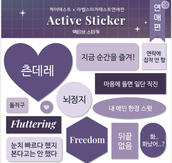 12개의 질문에 대한 답을 모두 선택하고 나면 라벨지에 프린팅 된 라벨처럼 다른 결과지를 받아볼 수 있답니다. 저는 액티비 스티커로 결과가 나왔답니다. 키워드로 츤데레, 돌직구, 지금 순간을 즐겨, 연락에 집착 안 함 이런 단어들이 나왔어요. 지금 바로 라벨스티커테스트 해보세요.