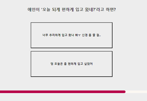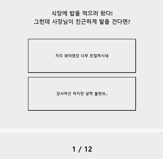 그래서 자주 와야겠다를 선택했어요. 이렇게 12개의 질문이 나오고 결과를 SNS나 카카오톡으로 친구들과 공유하며 얘기를 나누었더니 재미있었어요. 오늘 되게 편하게 입고 왔네?라는 질문에 저는 오늘은 좀 편하게 입고 싶어서라고 답했어요. 여러분은 어떤 답을 선택하고 싶으신가요?
