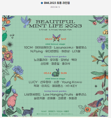 뷰티플 민트 라이프 2023 티켓은 인터파크, 예스 24, 위메프에서 예매하실 수 있어요. 취소, 환불 등과 관련 사항도 해당 예매처에서만 가능해요. 올해 BML(Beautiful Mint Life) 2023은 전 좌석 비지정석으로 진행된다고 하니 예매 시 참고하시면 좋을 것 같아요. 뷰티플 민트 라이프(뷰민라)는 본래 비지정석으로 스탠딩 존과 피크닉 존에서 자유롭게 관람할 수 있는 페스티벌이죠. 코로나19로 인해 사회적 거리를 두기 준수를 위해 BML 2021/ BML 2022는 지정좌석을 진행해고, 규제가 전면 해제되어 본래 뷰민라의 모습으로 돌아가기 위함이니 봄날의 뷰티블 민트 라이프를 즐기면 좋은 축제죠.