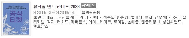 피크닉존 이용 시 개인 돗자리를 지참하셔야 하고, 온라인 현장 생중계는 아직 계획하고 있지 않기 때문에 온라인 티켓도 진행하지 않는다고 하며, 단체나 단체할인 등도 진행하지 않는다고 해요. 만 7세 미만의 아동은 티켓을 구매한 보호자 동반 시 무료입장이 가능하고, 증빙자료 지참하여 인포메이션 부스에서 확인해 주시면 된다고 해요. 뷰티풀 민트 라이프 2023의 티켓은 일자별 예매처당 1인 4매까지 구매 가능합니다. 토요일 예매했는데 일요일로 변경 불가. 변경을 원하는 경우 기존 예매한 티켓을 취소한 후 원하는 티켓을 다시 구매하셔야 해요.