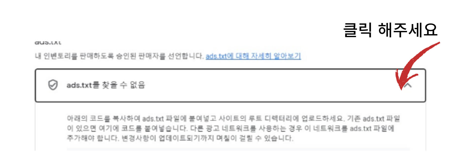 아래 그림과 같이 ads.txt를 찾을 수 없음. 옆 화살표 쪽에 있는 곳을 클릭하면 아래와 같은 메시지와 함께 ads. txt 복사하기 버튼이 있습니다. 복사를 해주세요.