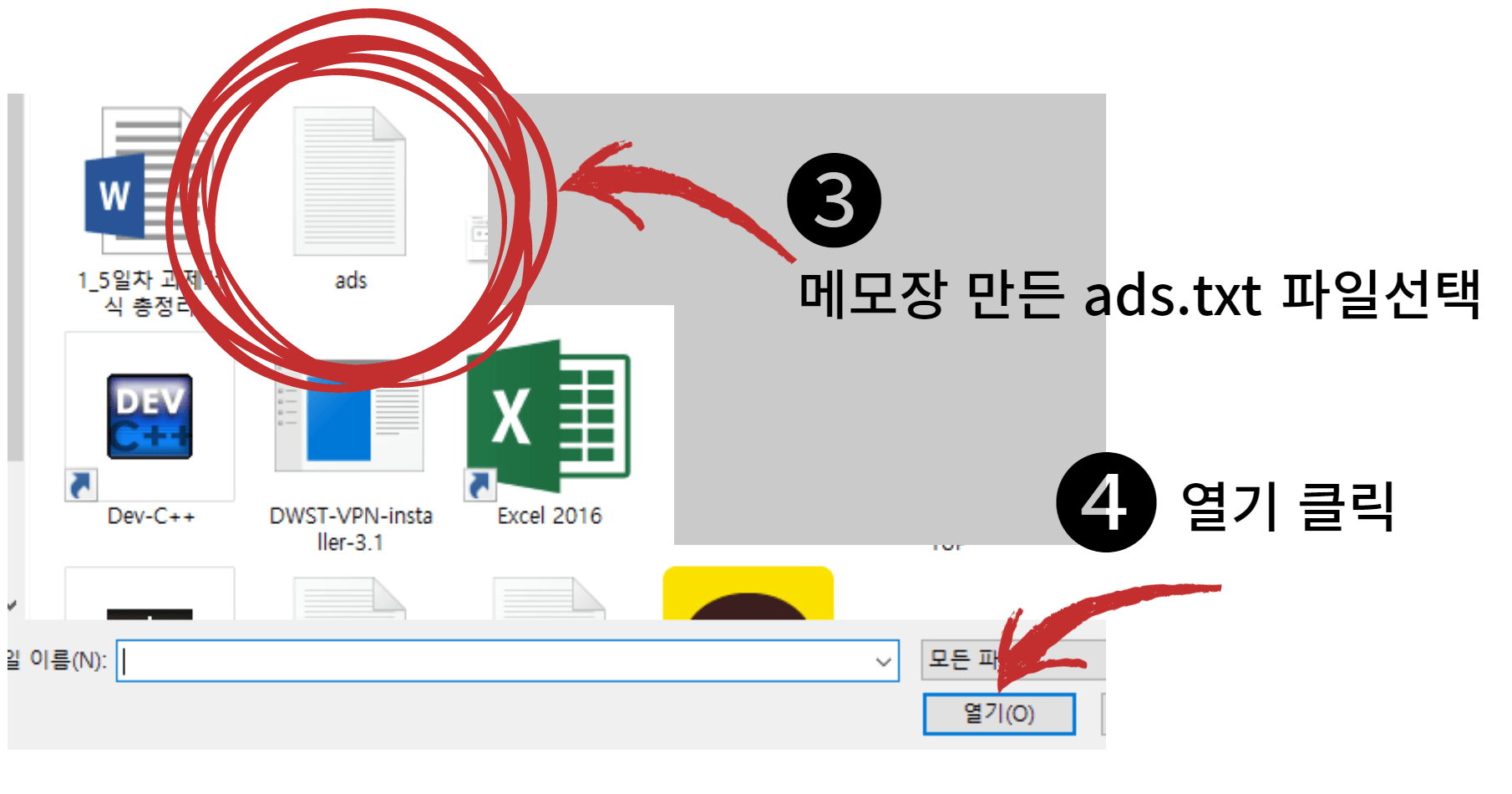 먼저 사진처럼 파일업로드를 클릭해서 먼저 1. 파일업로드. 2. 추가버튼 3. 파일선택에서 ads.txt파일 열기. 4. 적용.