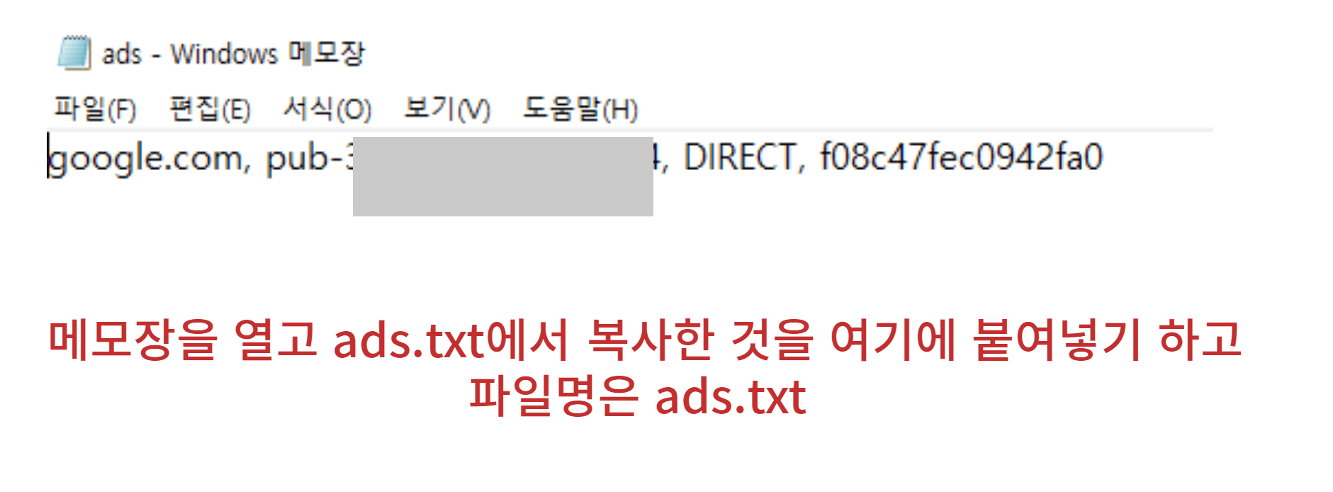 메모장에 복사한 Pub - 0000000000000. 이런 숫자가 나오있는 것을 붙여 넣기 해주시고 저장을 ads로 해주세요.
