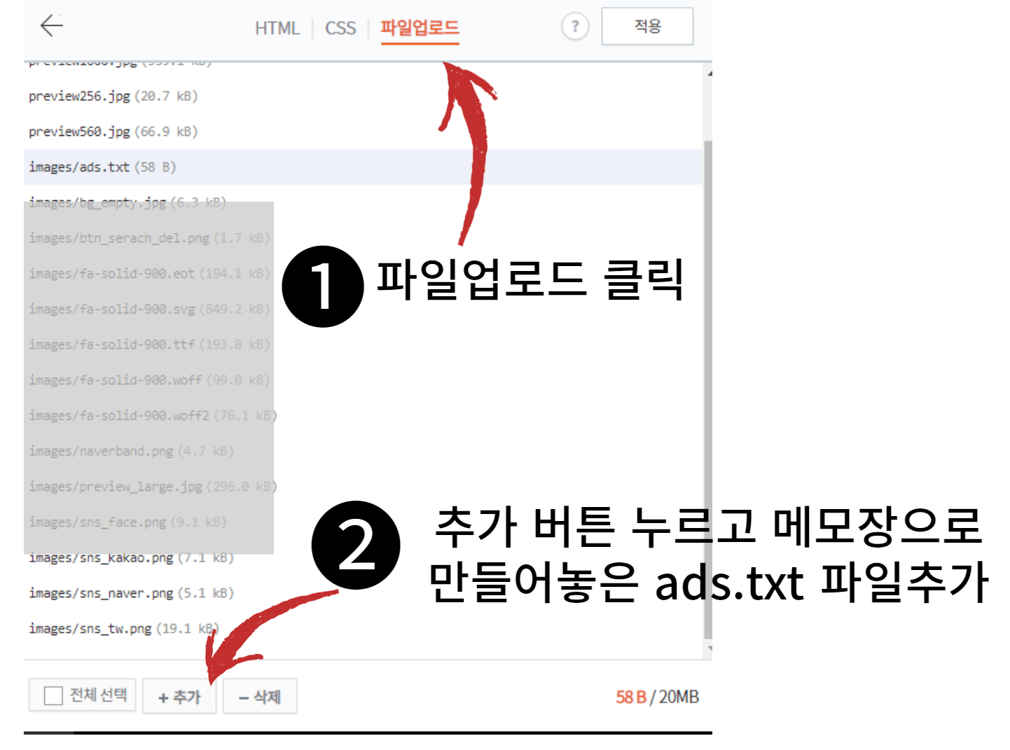 ▶▶티스토리→ Html 파일업로드 추가 →ads.txt 선택→적용