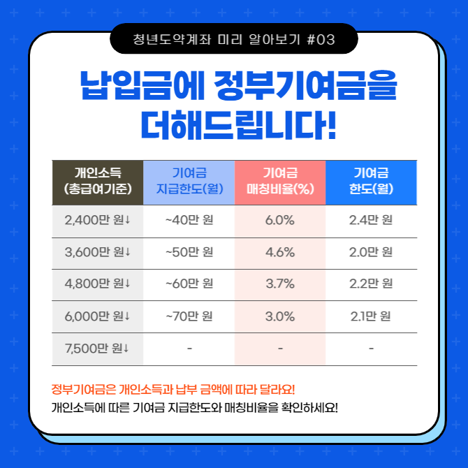 개인소득에 따른 기여금 지급한도와 매칭비율을 확인하시고 청년도약계좌 혜택받으세요.