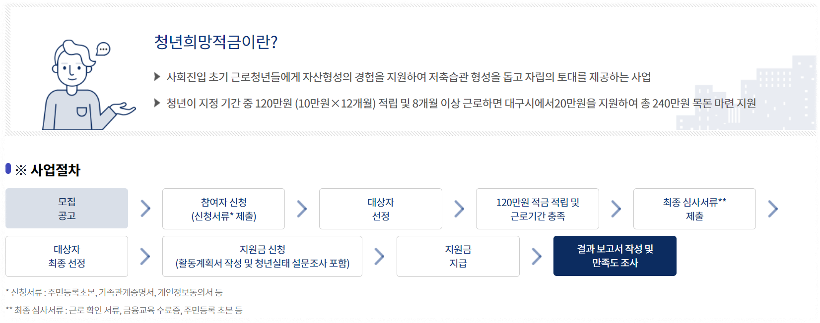 8개월 이상 근로하면서 총 120만 원을 처축하면 대구시에서 120만원을 지원하게 된다고 합니다.