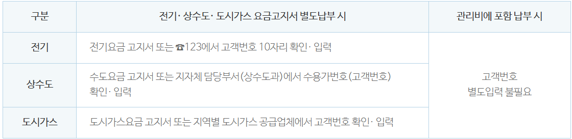 - 상수도 : 수도요금 고지서 또는 지자체 담당부서(상수도관)에서 고객번호(수용가번호) 확인가능