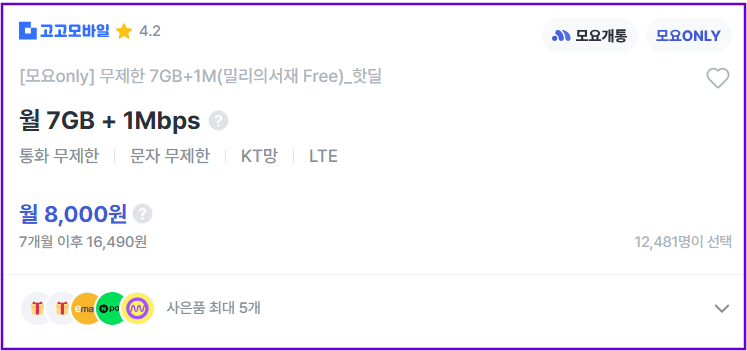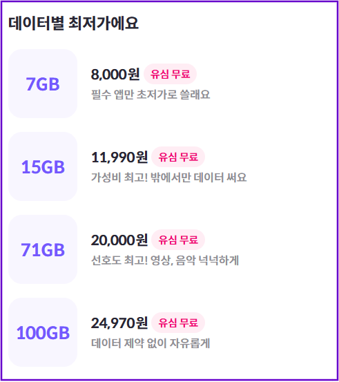 - 데이터 무제한, 음성 무제한, 저가 요금제 등 원하는 조건 선택