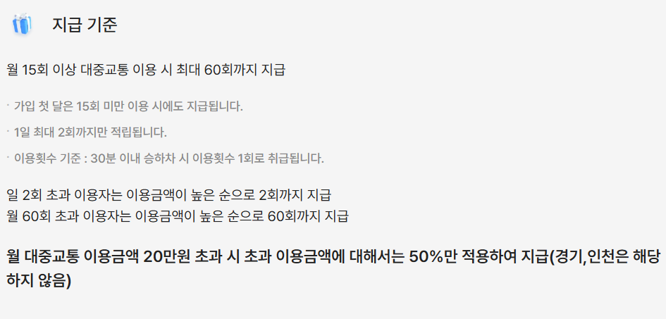 - 기본 기준: 월 교통비가 아닌 월 이용 횟수를 기준으로 적립됩니다. 하루 최대 적립 횟수는 2회로 제한되며, 월 최대 60회까지 인정됩니다.